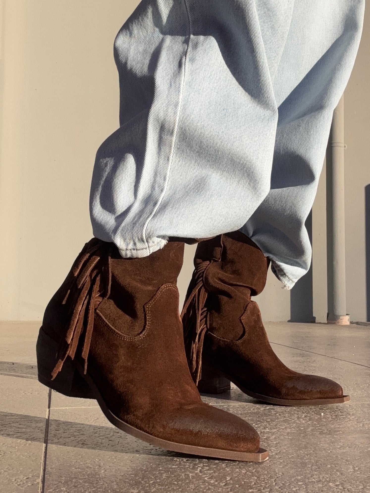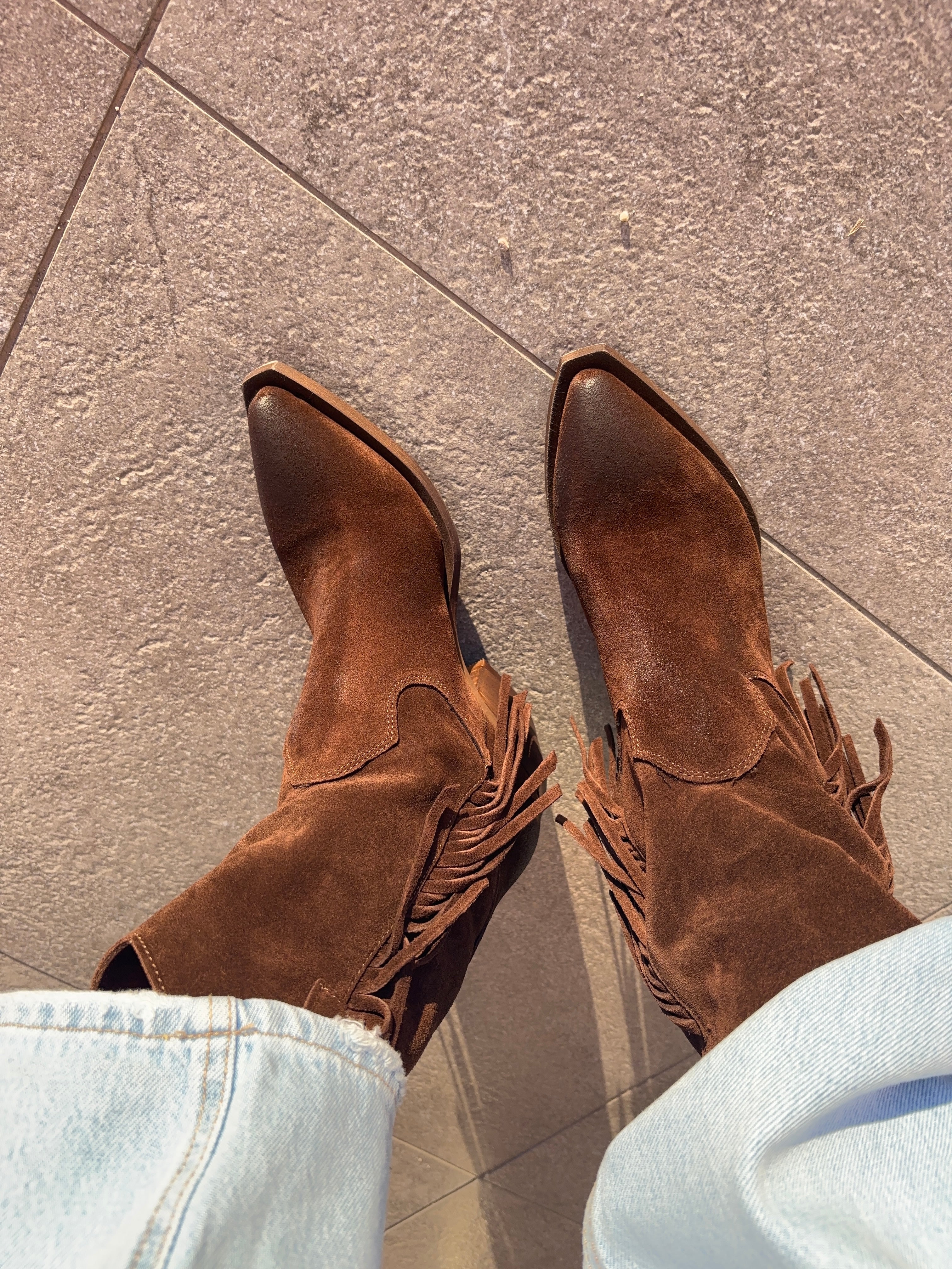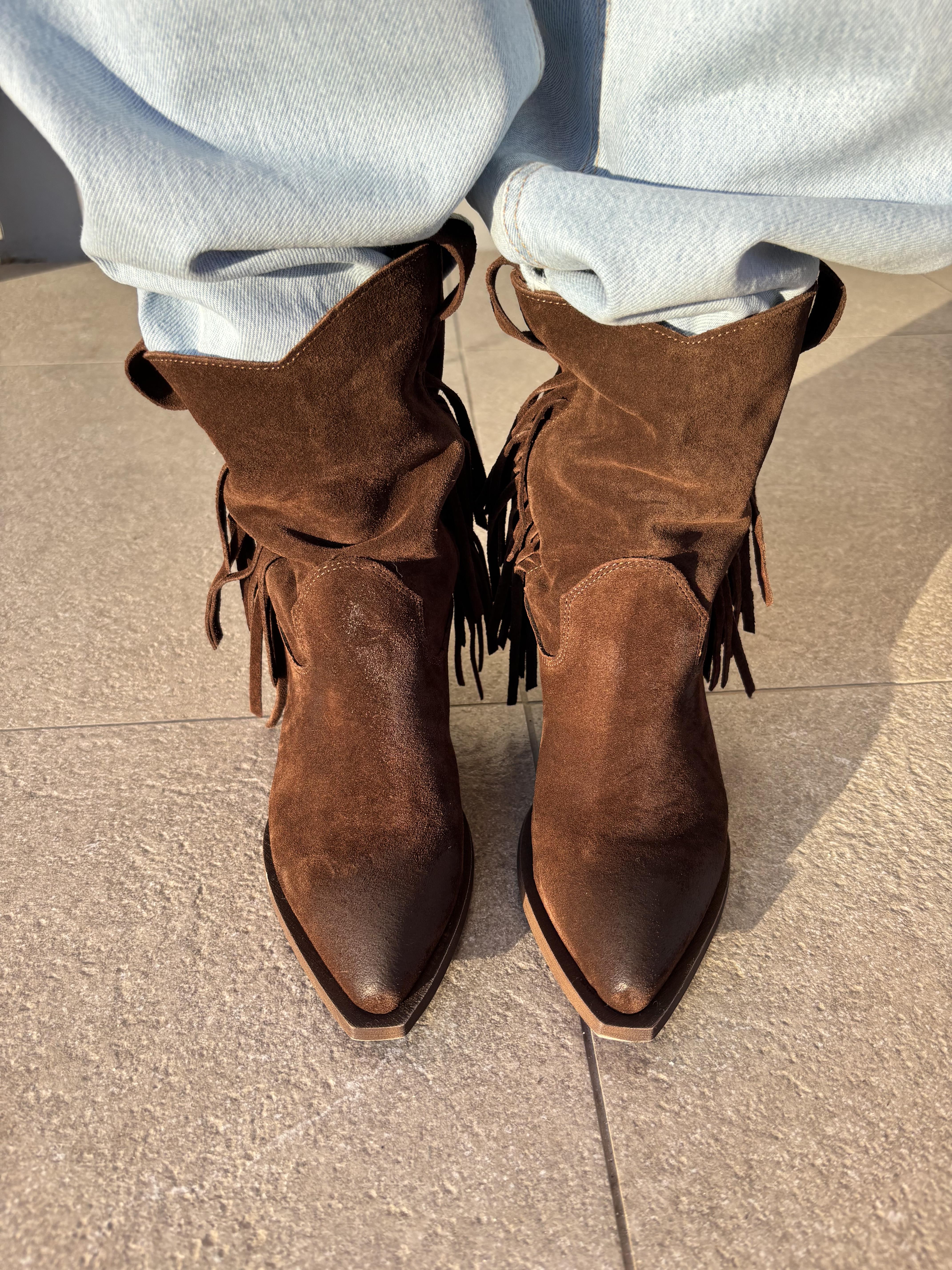 Modello altezza polpaccio, con gambale morbido e dettaglio frange.