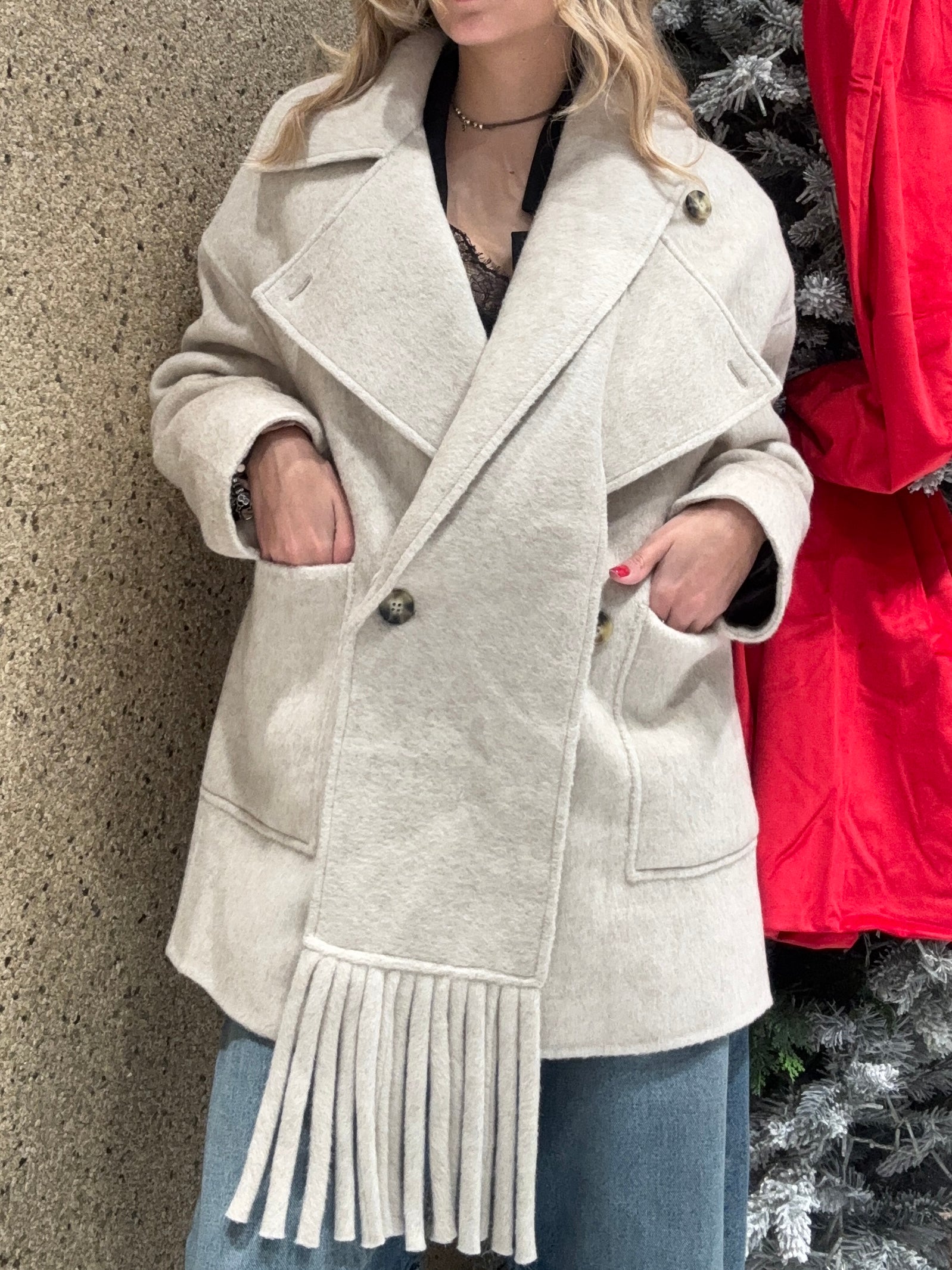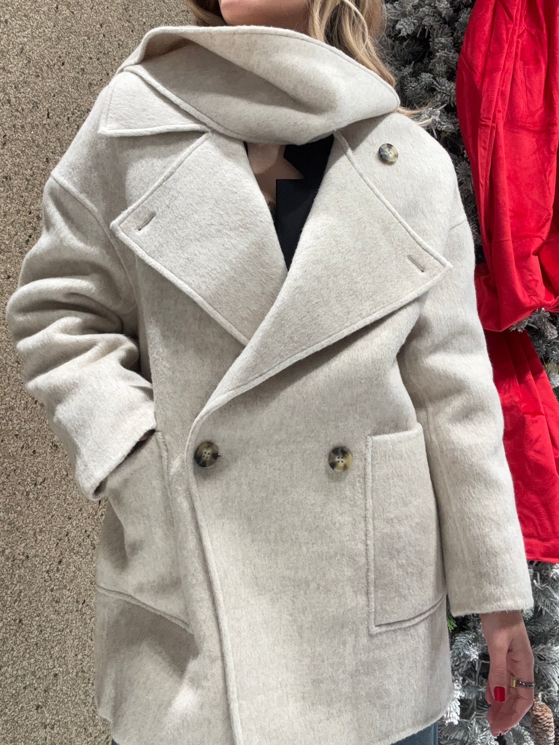 Cappotto midi maniche lunghe con collo a revers con sciarpa.Chiusura frontale doppio petto con bottoni tartarugati.Tasche frontali applicate